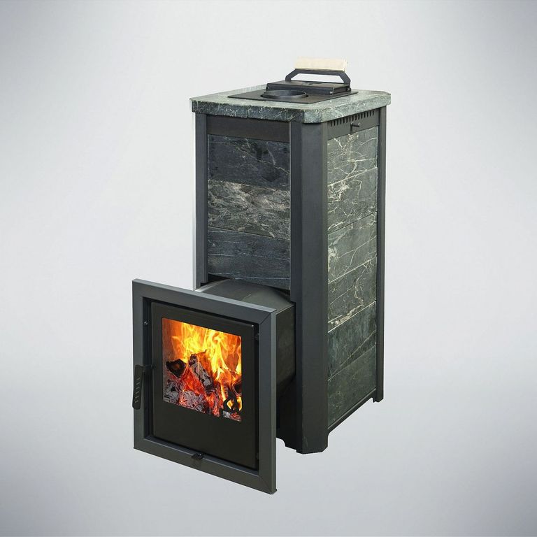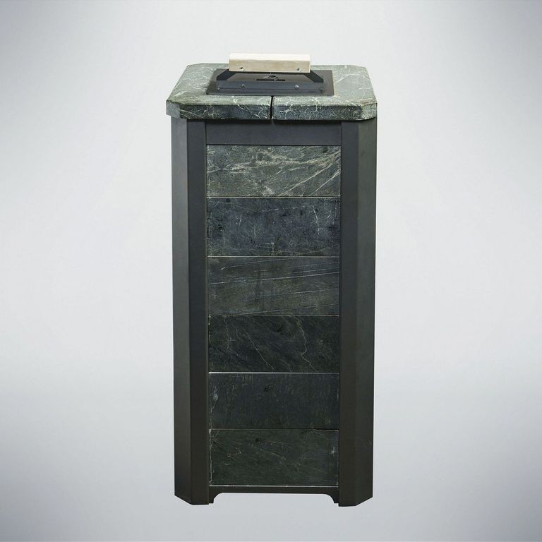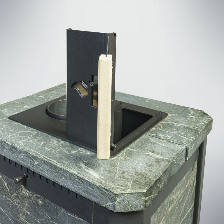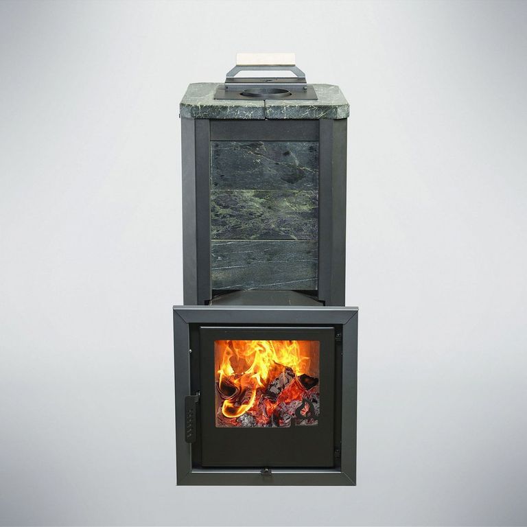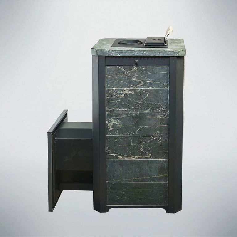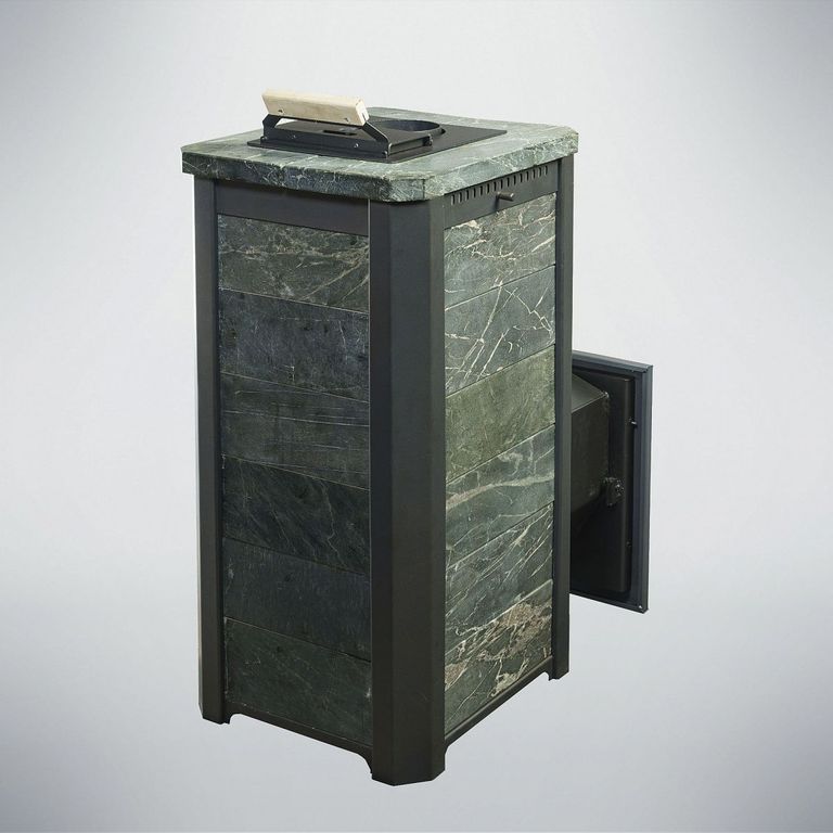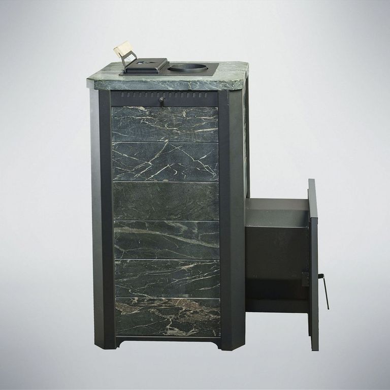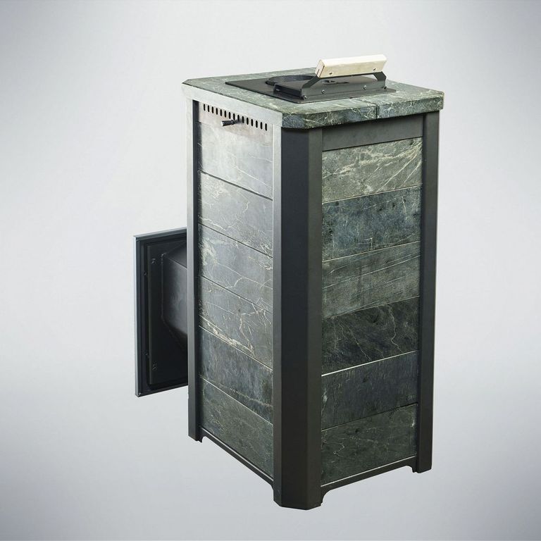 Внешний корпус печи облицован натуральным полированным камнем талькохлорит или змеевик толщиной 20-40 мм.