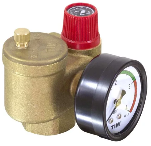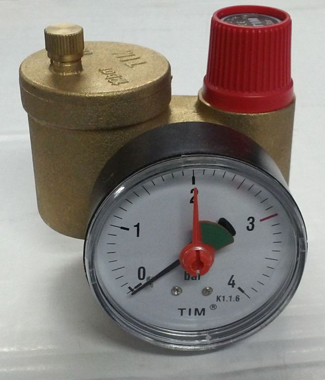 Группа безопасности котла TIM JH-1023-3,0 применяется в закрытых системах отопления для контроля и защиты от избыточного давления в системе и завоздушивания.