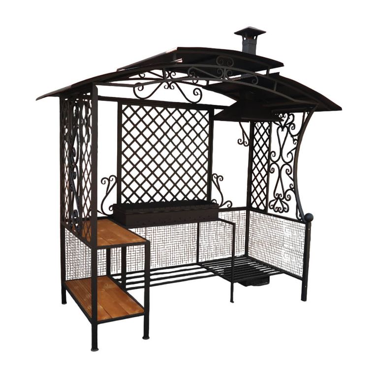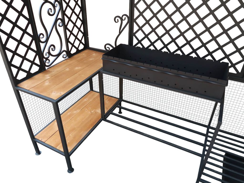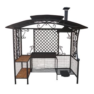 Представляет из себя сборную конструкцию с трехсекционной кровлей, элементами ковки и полками для размещения жаровни, тандыра до 150 кг, посуды, окрашенную порошковой краской RAL Черный Муар.