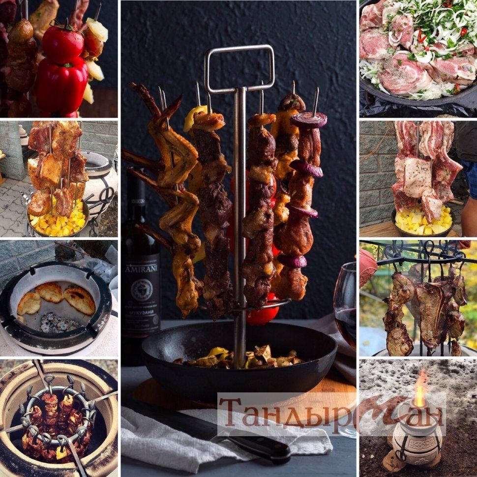Тритон для тандыра - один из самых красивых и практичных аксессуаров. На шампура нанизывается мясо и овощи, а сковорода загружается гарниром и опускается в тандыр на 20-30 минут. Тритон очень удобен в использовании. Сковороду можно легко открутить и вымыть, что облегчает эксплуатацию изделия.
