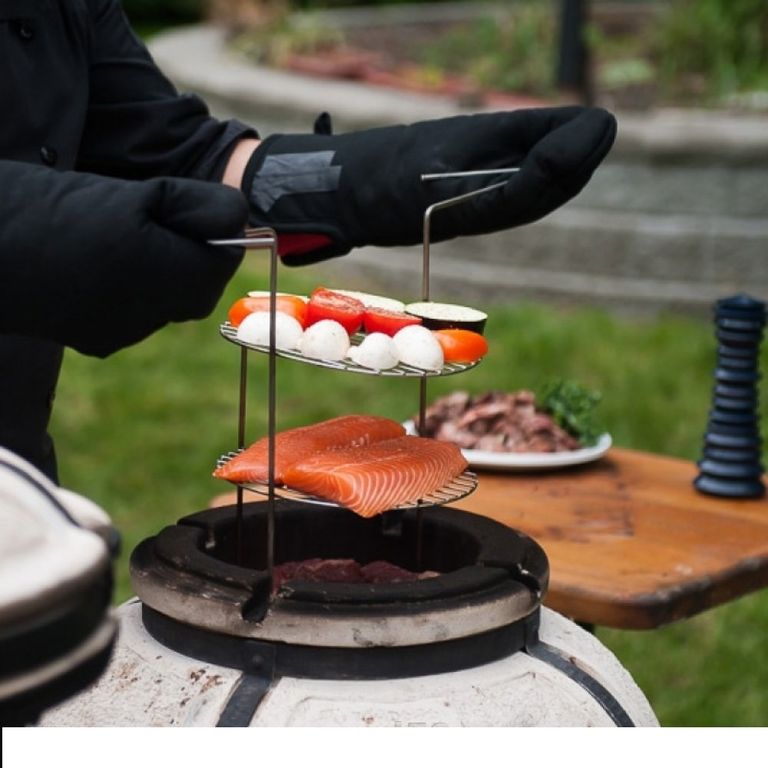 Позволяет с удобством и в большем объеме готовить мясные, овощные, рыбные блюда. Прекрасно заменят шампура! Положите нарезанные овощи на верхний ярус, а мясо или рыбу на нижние, и через несколько минут новое блюдо готово!