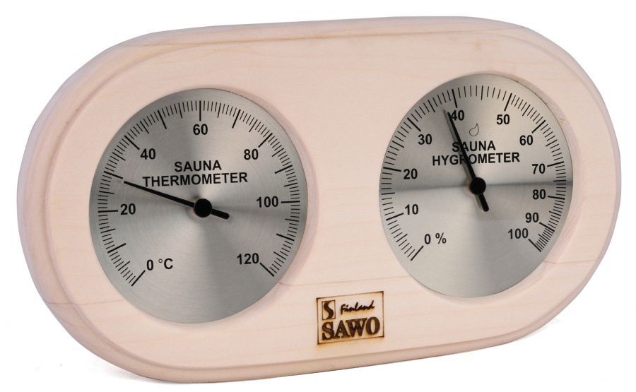 от компании Sawo имеет оригинальную прямоугольную форму со скруглёнными углами. В широкой рамке из древесины осины находится два круглых окошка. Под стеклом каждого окошка расположен графичный циферблат. Один из них - это гигрометр, который с точностью измерит уровень влажности в парной, другой - термометр, который сообщит о температуре воздуха. Данный прибор прекрасно подойдёт для использования в любом парильном помещении.