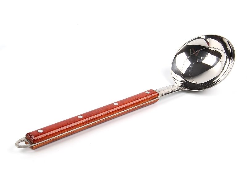 Изготовлен из пищевой нержавеющей стали толщиной 3 мм украшенной "резным орнаментом" с деревянной лакированной ручкой.