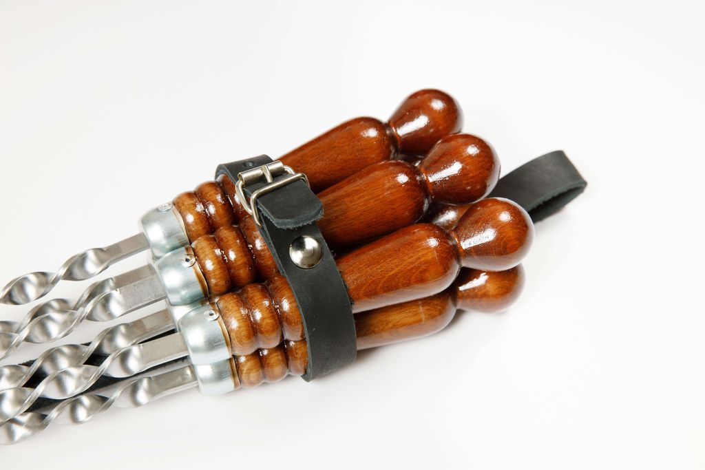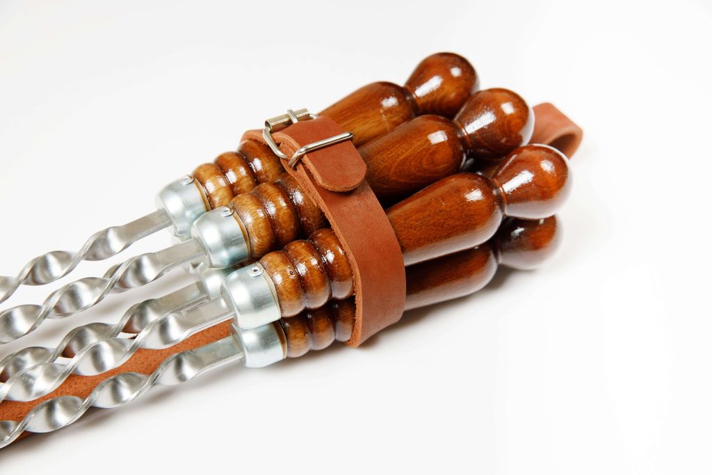 В набор входит получехол из кожи буйвола и 6 шампуров с деревянной лакированной ручкой 670х12х3 мм