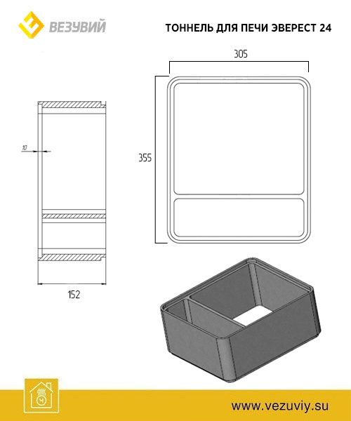 Конструктивно удлинитель повторяет штатный тоннель печи Эверест, с узким нижним поддувальным тоннелем и полноразмерным верхним топочным тоннелем.