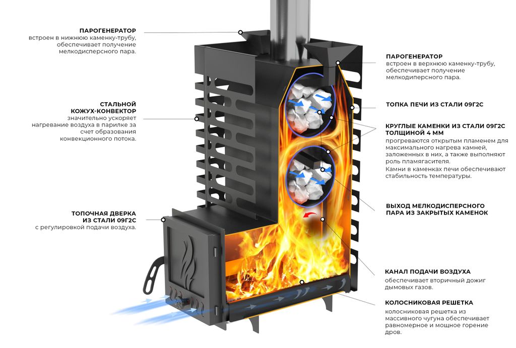 Банная печь с топкой из котловой стали 09Г2С для парной 18-22 м3.