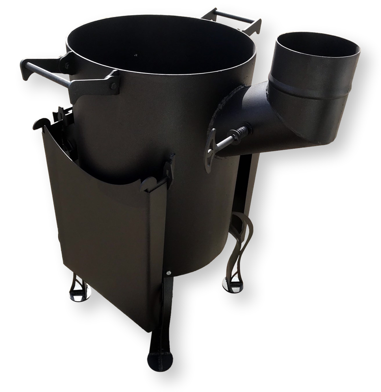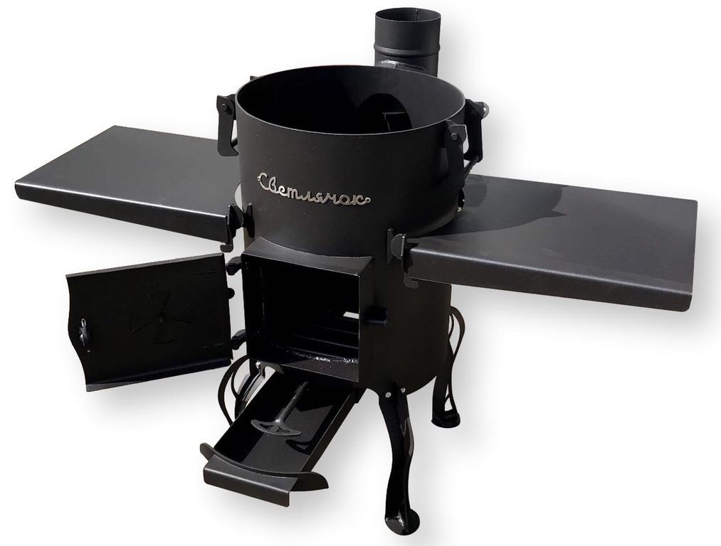 Комплектация: печь, 2 складывающихся столика, 3 трубы D=115 (L=370 мм), флюгарок.
