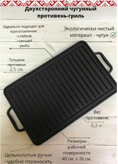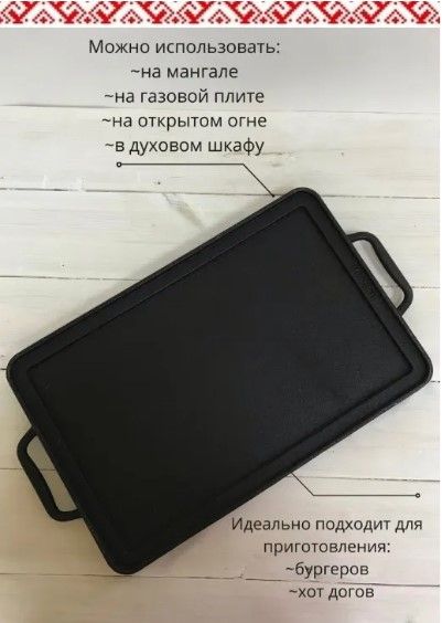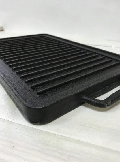 Двухсторонний чугунный противень гриль с ручками удобной прямоугольной формы - это идеальный кухонный инвентарь для приготовления различных блюд из мяса, рыбы, овощей на мангале, открытом огне, плите или духовом шкафу.