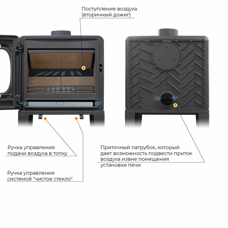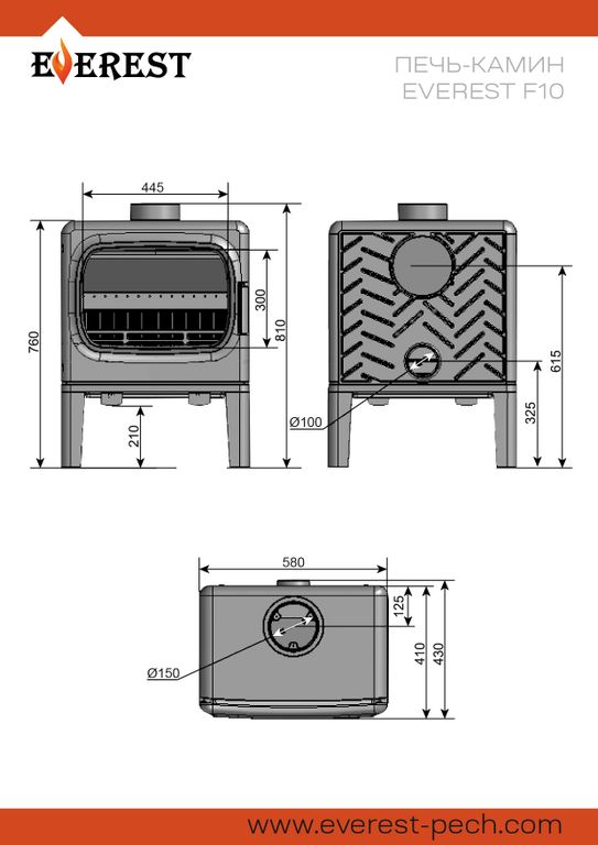 Печь-камин EVEREST F10 изготовлена из качественного жаростойкого чугуна с толщиной стенок 6-8 мм. Модель рассчитана на обогрев помещений объёмом до 200м³. Печь-камин имеет два пламегасителя: самый нагруженный пламегаситель изготовлен из вермикулита, второй из особо прочной котловой стали 09Г2С. Топка печи-камина усилена вермикулитовыми плитами с системой двухуровневого вторичного дожига. С помощью этой функции по каналам подачи вторичного воздуха поступает воздух, который нагревается при прохождении между топочной камерой и стенками корпуса. Далее нагретый воздух через дефлектор поступает в топку, перемешивается с газами - продуктами горения, чем вызывает повторное возгорание. Регулировка этой системы, как и подача воздуха в колосниковую зону, осуществляется рычагом, расположенным слева в нижней части печи-камина. В правой нижней части расположена ручка регулировки системы чистое стекло, которая помогает оставаться стеклу чистым.