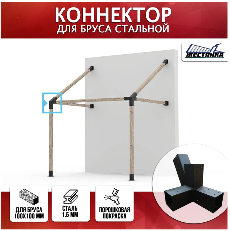 Коннектор четверной позволяет соединить между собой четыре бруса размером 100 на 100 мм