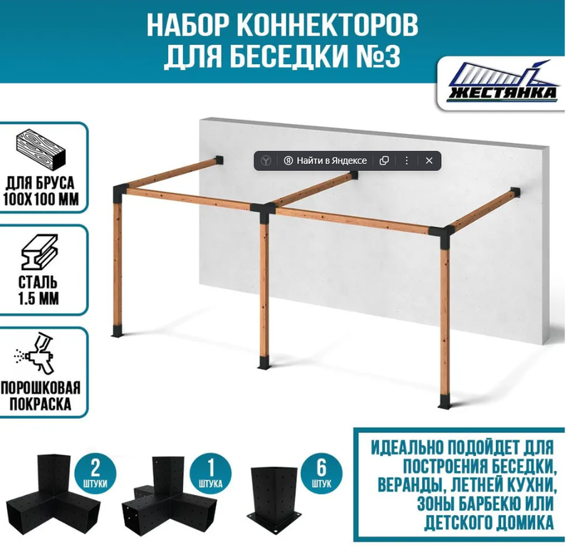 беседка, веранда, летняя кухня, зона барбекю или детский домик. Коннекторы позволяют соединить между собой брусья размером 100 на 100 мм и надежно их зафиксировать.