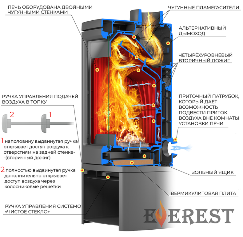 Печь-камин имеет два чугунных пламегасителя, обеспечивающие высокий КПД печи. Топка печи-камина усилена чугунными вставками с системой четырехуровневого вторичного дожига.