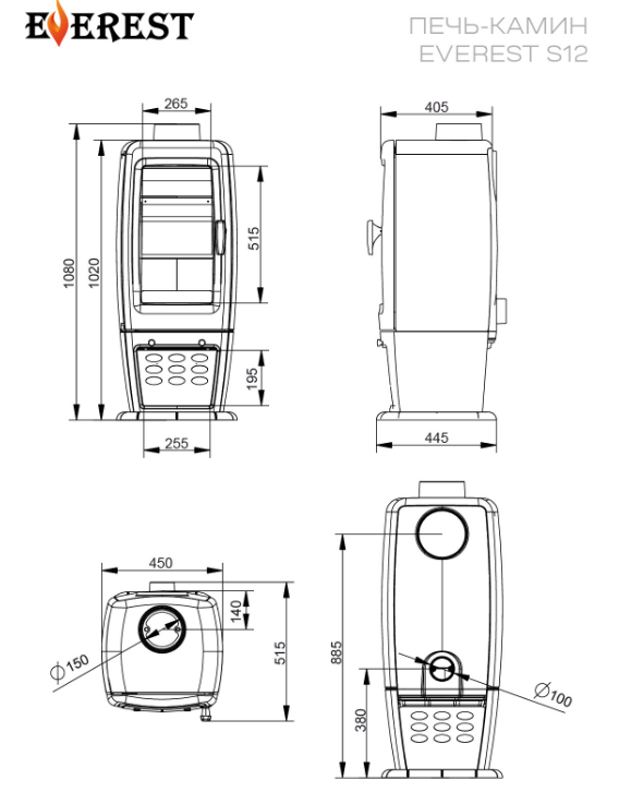 Печь-камин EVEREST H12/ Н12М изготовлена из качественного жаростойкого чугуна с толщиной стенок 6-8мм.