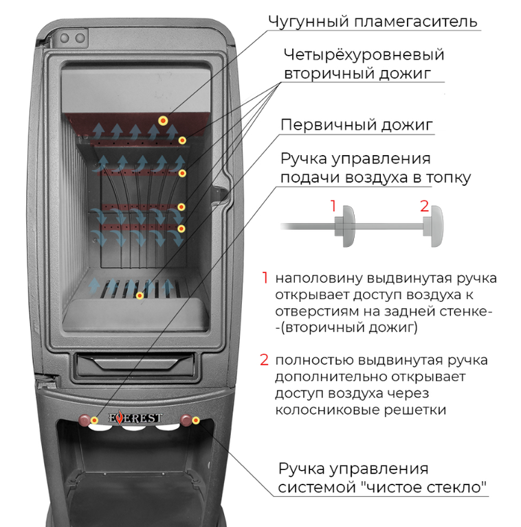 Печь-камин имеет два чугунных пламегасителя, обеспечивающие высокий КПД печи. Топка печи-камина усилена чугунными вставками с системой четырехуровневого вторичного дожига.
