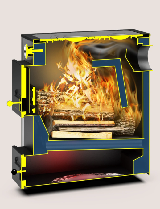 - Глубокая наклонная топка для использования длинных дров и равномерного распределения угля по всей глубине топки при засыпке.