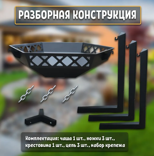 Чаша выполнена из стали толщиной 3 мм и окрашена специальной температуростойкой краской черного цвета, выдерживающей высокие температуры до 1200 градусов по цельсию, обеспечивая долгий срок службы и надежность.